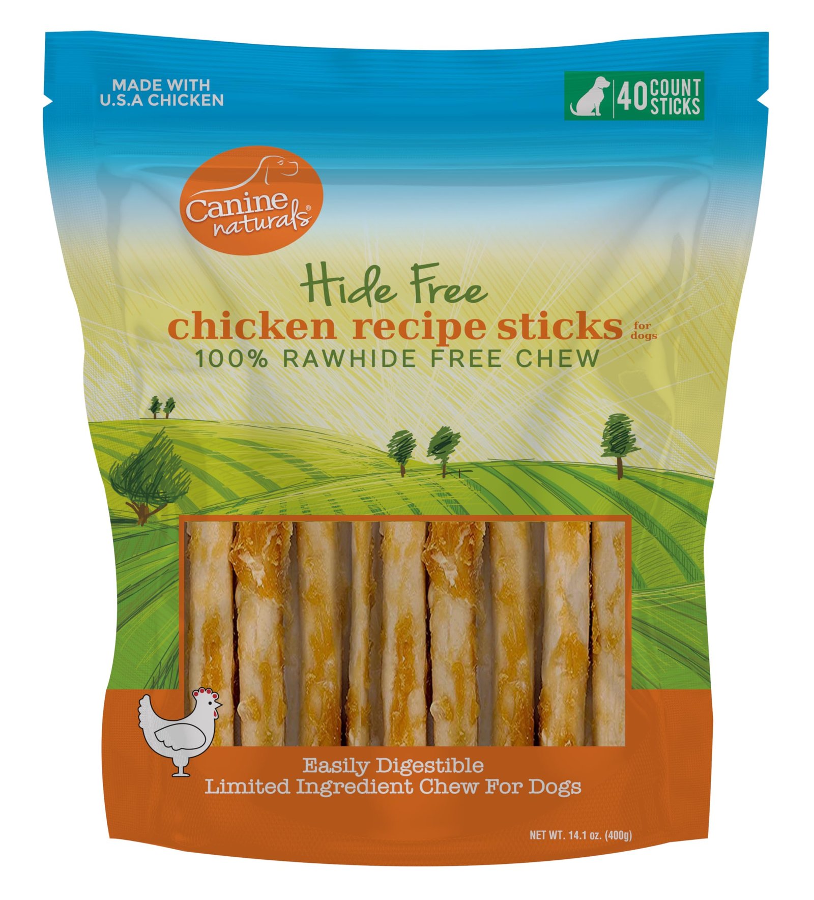 Canine NaturalsⓇ Hide Free Chews are a healthy and delicious alternative to rawhide products. Some brands or product names imply their chews are hide-free, when in fact “collagen” derived from rawhide or some form of animal hide is used in their process. Why? Because animal hide provides a longer chew time for a lower cost as a by-product of other production, which can be difficult for your dog to digest. We proudly state 100% Rawhide Free directly on our packaging. With the 40 pack of our 5” chicken chew sticks they’ll still enjoy plenty of healthy, safe, and satisfying chew time.** Our limited ingredient recipe is lab proven to be up to 400% more digestible than rawhide based products.* Because we use whole muscle meat and not chicken parts, your dog will enjoy delicious chicken raised and sourced right here in the USA. Made with care and integrity; our healthy chews contain zero artificial flavors, colors, or filler ingredients like corn, wheat, or soy. More than just a tasty treat,