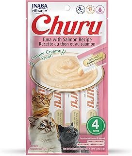 INABA Churu Cat Treats, Grain-Free, Lickable, Squeezable Creamy Purée Cat Treat/Topper with Vitamin E & Taurine, 0.5 Ounces Each Tube, 4 Tubes, Tuna with Salmon Recipe