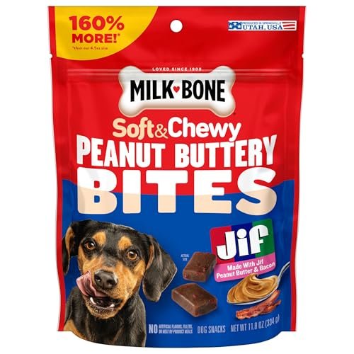 Did someone say … "peanut butter"?! For dogs, that's a mouthwatering, wag-inducing testament of love. But serving it with a jar and spoon isn't always the most convenient way … or the cleanest. Fortunately, there's an easy way to unleash that peanut butter joy. Milk-Bone Peanut Buttery Bites are deliciously soft, chewy and convenient bite-sized dog treats made with Jif peanut butter. They contain no artificial flavors, no artificial colors and no fillers — just high-quality, flavorful ingredients your dog will love. These premium soft and chewy dog snacks are easy-to-eat, wholesome treats you can feel good about feeding to your dog. Stock up now to share that irresistible Jif peanut butter taste every day.