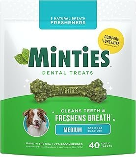 Minties Dental Chews for Dogs, 40 Count, Vet-Recommended Mint-Flavored Dental Dog Treats for Medium Dogs, Bones Clean Teeth, Fight Bad Breath, and Removes Plaque and Tartar