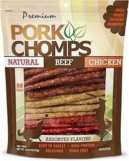 Pork Chomps Dog Chews, 5 Inch Munchy Sticks, 50 Count – Assorted Flavors: Roasted Pork, Chicken, & Bacon – Long-Lasting Treats for Dogs – High Protein, Low Fat, Healthy & Delicious Chews (1 Pack)