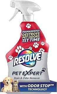Resolve Pet Expert stain and odor remover for carpets and upholstery. Removes set-in pet stains and neutralizes odors using an enzymatic cleaning formula that works on both fresh and dried messes.